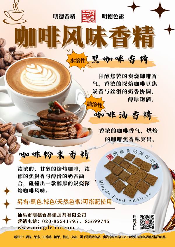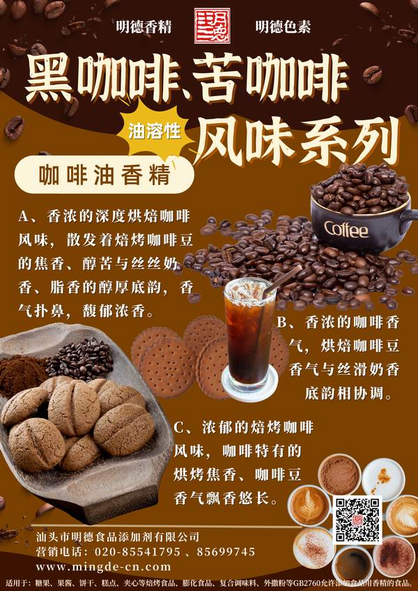 近年來(lái),國(guó)內(nèi)咖啡消費(fèi)氛圍愈來(lái)愈濃,咖啡風(fēng)味多元融入了各個(gè)領(lǐng)域,如 果凍、餅干、雪糕等,甚至應(yīng)用于室內(nèi)香氛等。順應(yīng)市場(chǎng)潮流,提升味覺(jué)體驗(yàn)。汕頭市明德食品添加劑有限公司不斷創(chuàng)新、潛心專(zhuān)研,當(dāng)前我們擁有20余款咖啡相關(guān)風(fēng)味的香精,供您選擇。并持續(xù)不斷創(chuàng)新,努力研發(fā)更多符合市場(chǎng)需求的風(fēng)味。