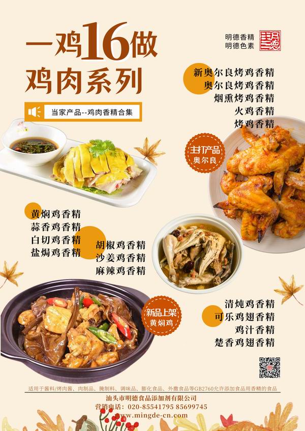 在雞肉香精領(lǐng)域我們潛心專(zhuān)研,結(jié)合市場(chǎng)潮流,消費(fèi)者喜好,汕頭市明德食品添加劑有限公司現(xiàn)有以下16種雞肉相關(guān)風(fēng)味的香精,供您選擇。并持續(xù)努力研發(fā)更多符合市場(chǎng)需求的風(fēng)味。