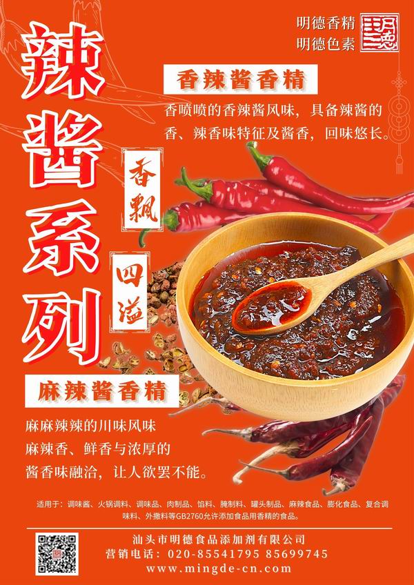 明德 麻辣醬香精、香辣醬香精 香飄四溢。麻麻辣辣的川味麻辣香、鮮香與濃厚的醬香相融合。香噴噴的香辣醬風味,具備辣醬的醬香和辣香味交融,回味悠長,令人垂涎欲滴。