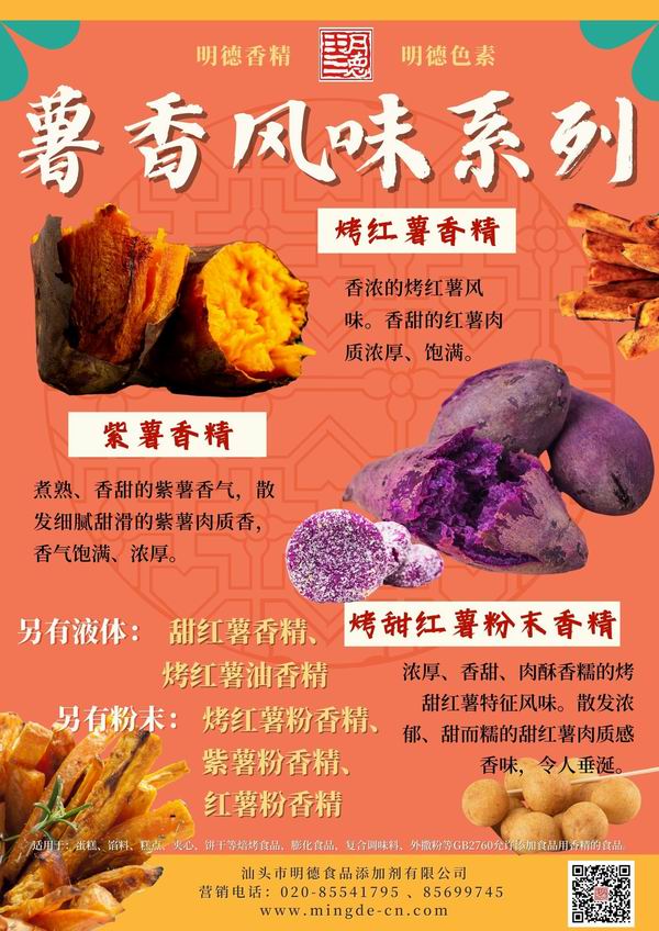 在薯味香精領域我們數十年潛心專研,迎合市場需求,滿足消費者喜好,汕頭市明德食品添加劑有限公司,推出了多種風味的番薯風味香精,如:紫薯香精、紅薯香精、烤紫薯香精、烤紅薯香精、甜紅薯香精等。