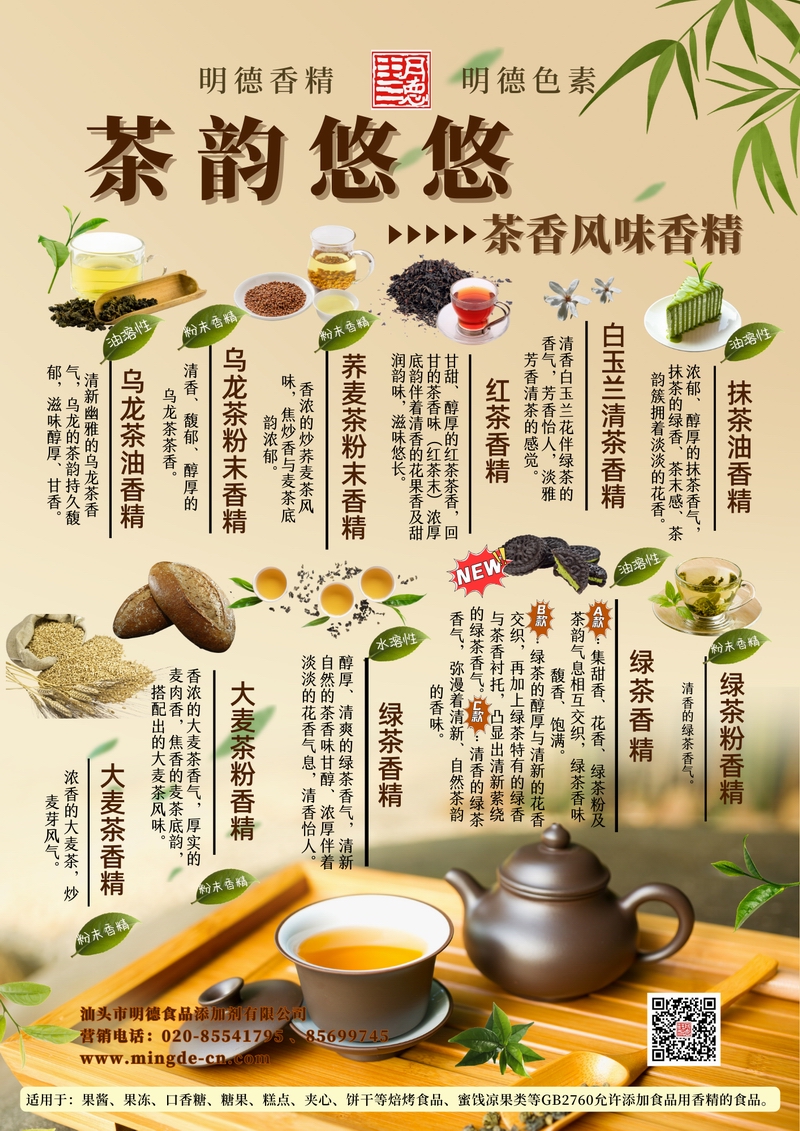 汕頭市明德食品添加劑有限公司推出的茶香風(fēng)味系列香精,涵蓋烏龍茶、蕎麥茶、紅茶、白玉蘭清茶、抹茶、大麥茶、綠茶等多種茶類調(diào)性,滿足飲品、烘焙、糖果、乳制品、調(diào)味品等多領(lǐng)域的茶香需求,為B端客戶提供穩(wěn)定、真實(shí)的茶韻香氣解決方案。