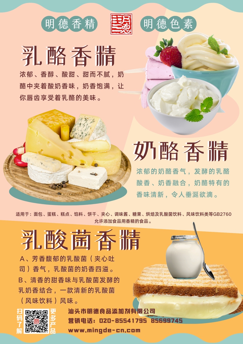 明德乳酪風(fēng)味系列香精 豐富乳品風(fēng)味 助力高品質(zhì)應(yīng)用汕頭市明德食品添加劑有限公司推出的乳酪風(fēng)味系列香精,涵蓋乳酪香精、奶酪香精、乳酸菌香精等多種調(diào)性,風(fēng)味層次包括發(fā)酵香、奶香、酸甜香等,留香穩(wěn)定,可滿(mǎn)足烘焙、飲料、糖果及復(fù)合調(diào)味等B端工廠(chǎng)的應(yīng)用需求。